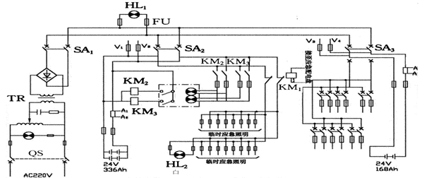 在每一个充电回路应设有防止逆流的逆电流继电器或二极管,当主应急电网都失电时,接触器ZC1线圈失电,常闭触头闭合,直接向小应急用电设备供电,其余用电设备分别利用开关送电。
